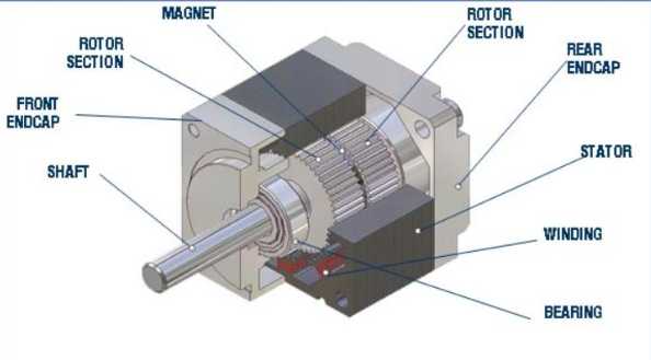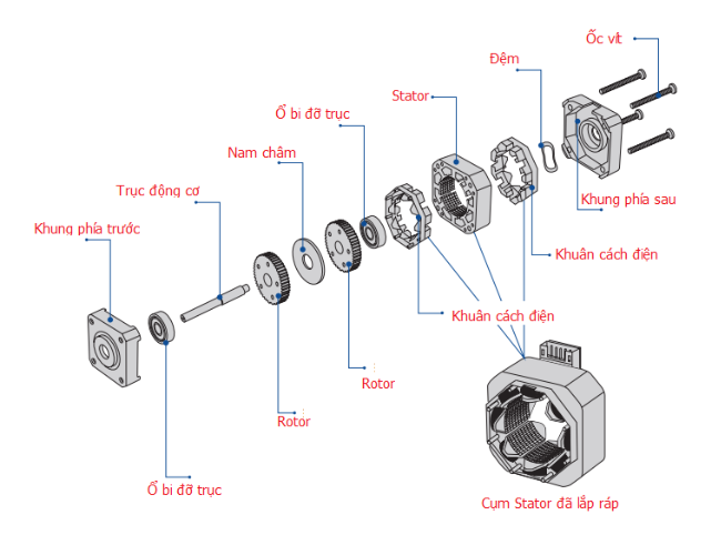 Thân động cơ bước: chịu trách nhiệm nhận tín hiệu xung và dẫn động cơ cấu truyền động.